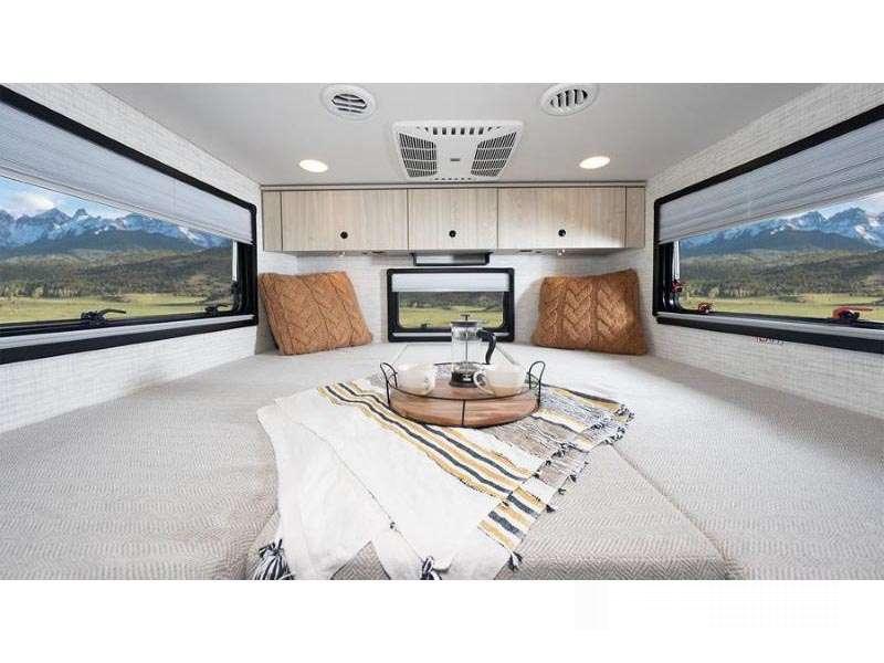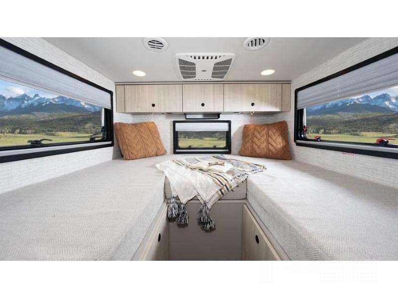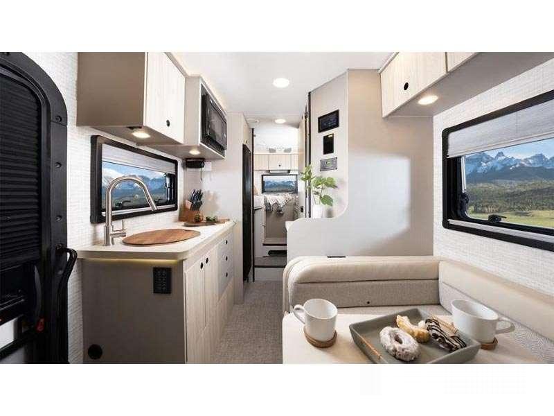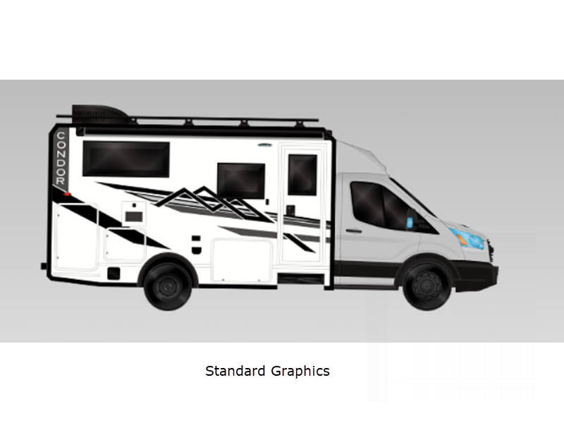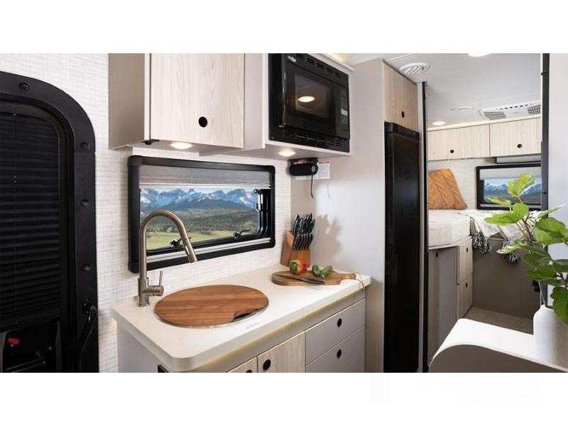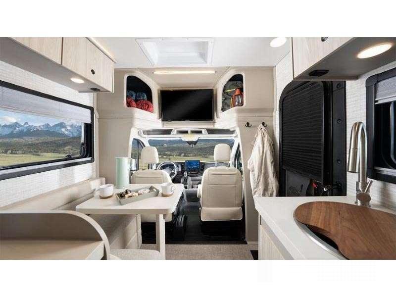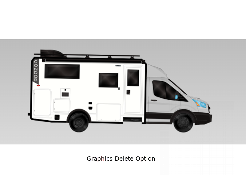 Sleeps 2 Length 23 ft 5 in Ext Width 7 ft 1 in Ext Height 11 ft 1 in Int Height 6 ft 8 in Interior Color Grotto, Oakley Exterior Color Standard Graphics. Graphics Delete Option. Full-Body Paint; Black Hills, Conifer, Magnet, Sandy Oak GVWR 11000 lbs Fresh Water Capacity 53 gals Grey Water Capacity 51 gals Black Water Capacity 4.75 gals Tire Size 205/75R16C Furnace BTU 17000 btu Generator 2,800W Gas Fuel Type Gas Engine 3.5L EcoBoost V6 Chassis Ford Transit 350HD AWD Horsepower 310 hp Fuel Capacity 31 gals Wheelbase 156 in Available Beds Twin Bed with King Conversion Torque 400 ft-lb Refrigerator Type 12V Refrigerator Size 5.3 cu ft Convection Cooking Yes Cooktop Burners 1 Shower Size 30" x 30" Number of Awnings 1 Axle Weight Front 4630 lbs Axle Weight Rear 7275 lbs LP Tank Capacity 6 gal. Water Heater Type Timberline Binar 5D Hydronic AC BTU 13500 btu Awning Info 14' Electric patio awning with auto-retract and LED lights Gross Combined Weight 15000 lbs Shower Type Wet/Bath Shower Electrical Service 30 amp Similar Floorplans
