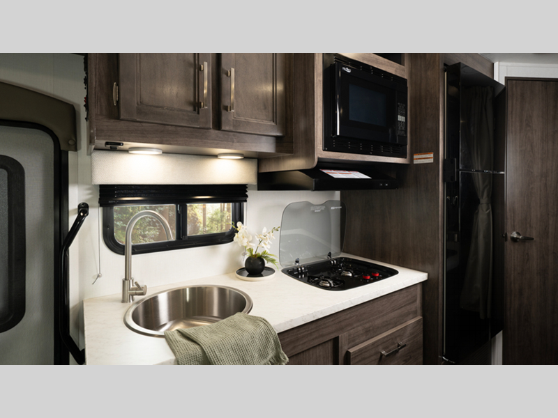 • One-piece, seamless, fiberglass front cap; Electric patio awning; heated holding tanks (12V pads); Black holding tank sprayer; Backup camera; LED HD Smart TV