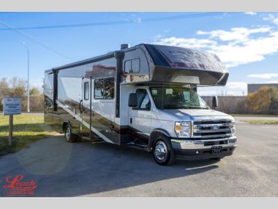 Sleeps 6 Slides 1 Length 31 ft 11 in Ext Width 8 ft 5 in Ext Height 11 ft 3 in Exterior Color Standard Graphics. Full-Body Paint; Pacific, Garnet GVWR 14500 lbs Fresh Water Capacity 44 gals Grey Water Capacity 39 gals Black Water Capacity 39 gals Furnace BTU 30000 btu Generator 4.0 kW Gas Fuel Type Gasoline Chassis Ford Fuel Capacity 55 gals Wheelbase 220 in Number Of Bunks 1 Available Beds Queen Refrigerator Type 12V Refrigerator Size 10.7 cu ft Convection Cooking Yes Cooktop Burners 3 Shower Size 24" x 36" Number of Awnings 1 Axle Weight Front 5000 lbs Axle Weight Rear 9600 lbs LP Tank Capacity 41 lbs Water Heater Capacity 6 gal Water Heater Type DSI Gas/Electric AC BTU 15000 btu TV Info LR 12V LED TV, BR 12V TV Awning Info 18' Power w/LED Light Strip Gross Combined Weight 22000 lbs Shower Type Standard Electrical Service 30 amp Similar Motor Home Class C Floorplans