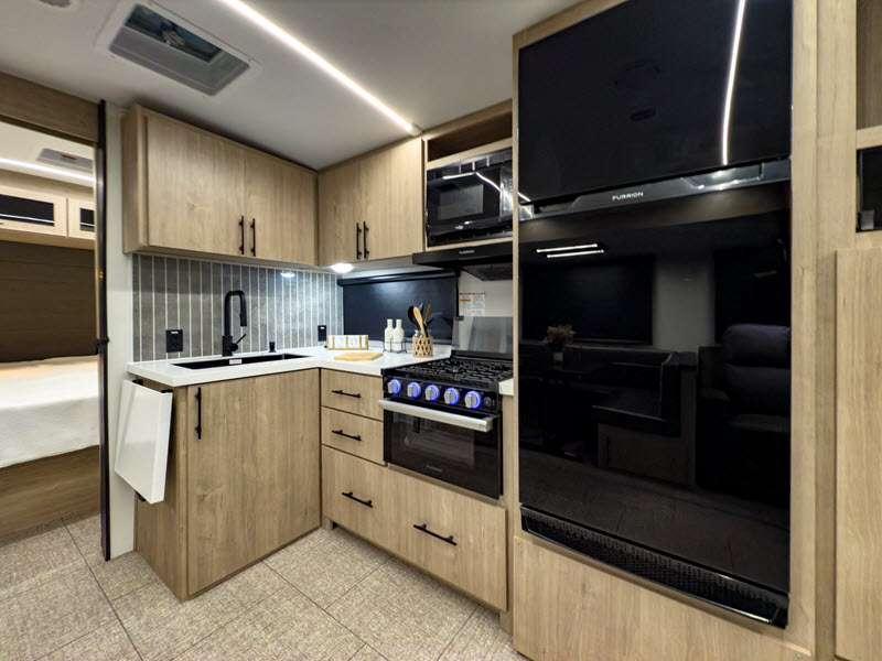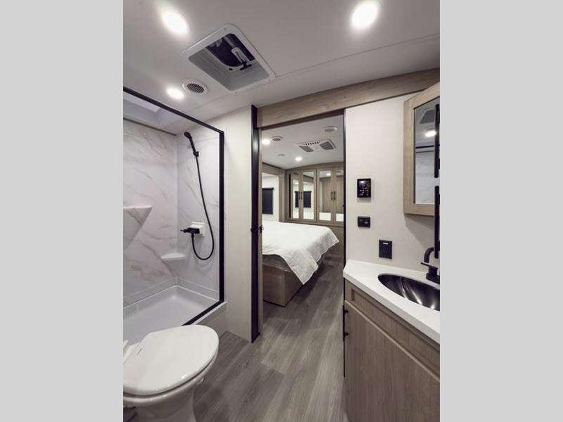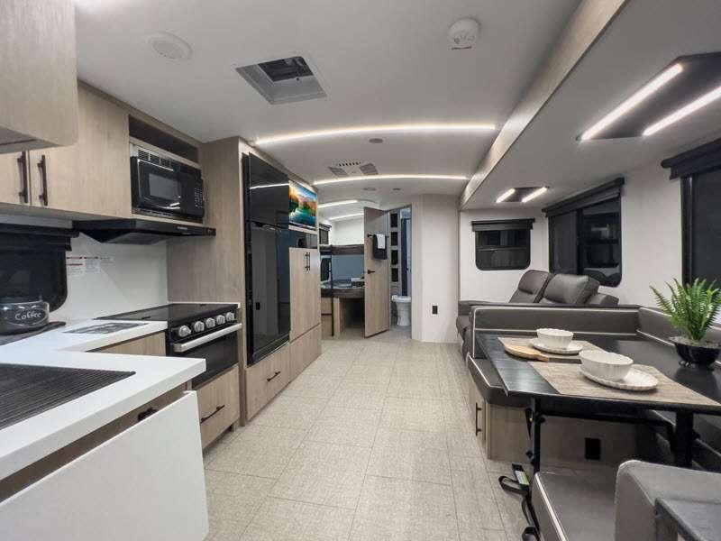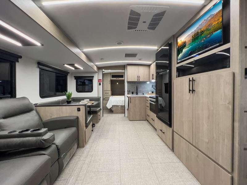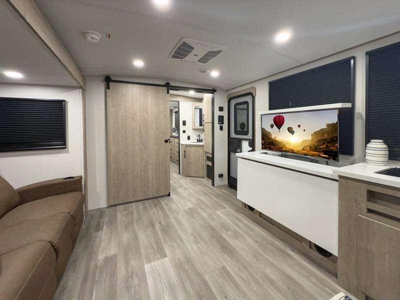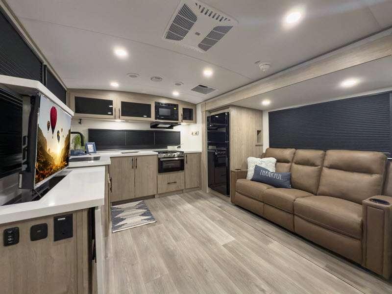 Each of these includes exceptional features, like a 200W roof-mounted solar panel, high-capacity furnace, residential cabinetry, spare tire & carrier, and a universal docking station. Additionally, you'll have accommodating features scattered all throughout the trailer with the upgraded residential furniture in the interior, the solid surface countertops in the kitchen, motion sensor entry LED lighting, and the large panoramic windows in the interior. The aluminum framed fully laminated sidewalls and enclosed underbelly with suspended tanks will hold them up for your adventures on the road!