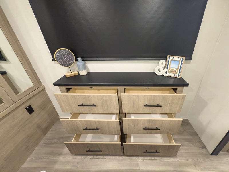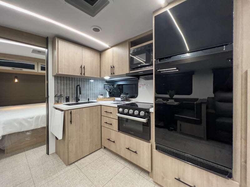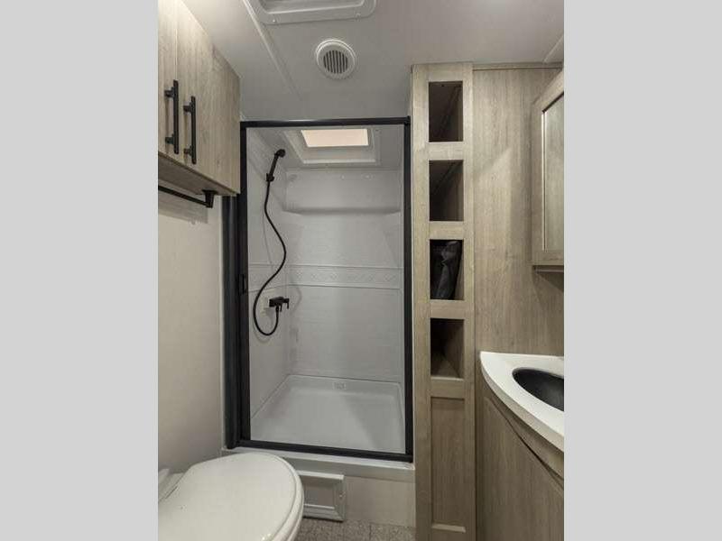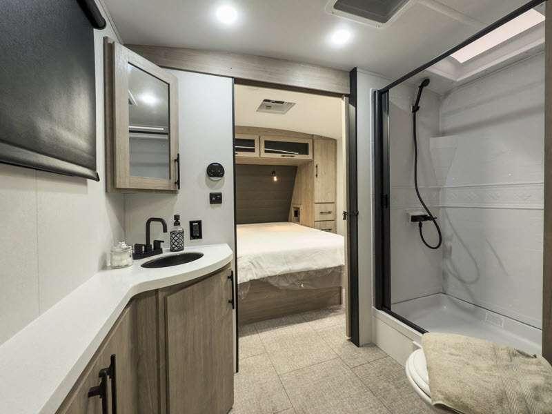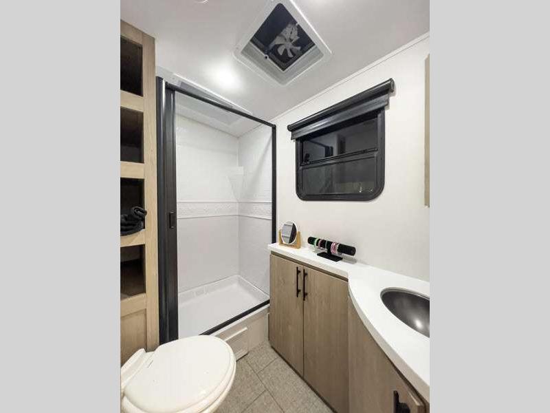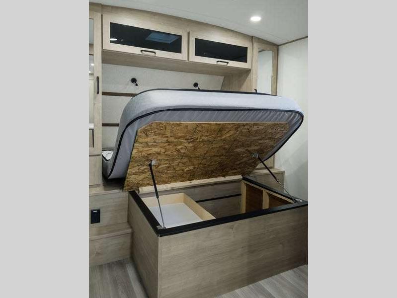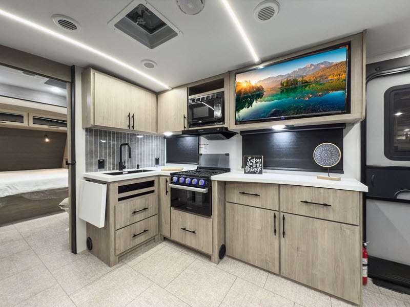 Each of these includes exceptional features, like a 200W roof-mounted solar panel, high-capacity furnace, residential cabinetry, spare tire & carrier, and a universal docking station. Additionally, you'll have accommodating features scattered all throughout the trailer with the upgraded residential furniture in the interior, the solid surface countertops in the kitchen, motion sensor entry LED lighting, and the large panoramic windows in the interior. The aluminum framed fully laminated sidewalls and enclosed underbelly with suspended tanks will hold them up for your adventures on the road!