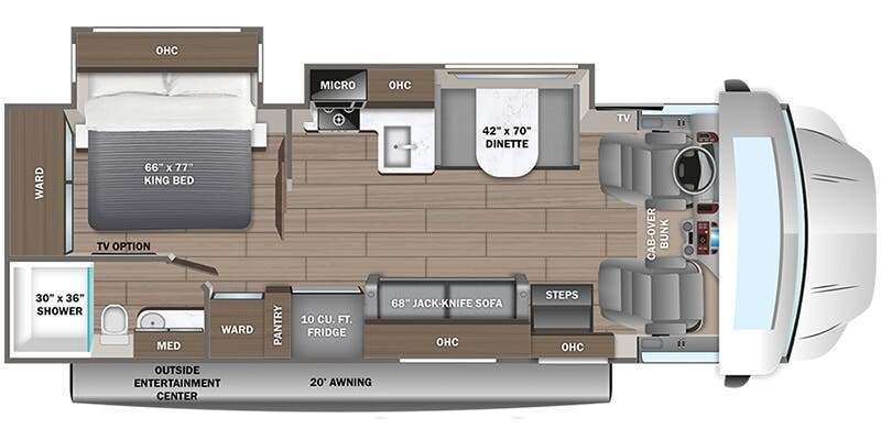 Customer Value Package (Mandatory): E-Z Drive™ Elite; One-piece, seamless fiberglass front cap; Automotive-bonded panoramic window in front cap w/ power shade; Automatic hydraulic leveling jacks; Frameless windows; Electric patio awning w/ LED lights; Exterior LED HD Smart TV with (2) JBL® high-output, marine-grade exterior speakers; 1,000W inverter; Chrome, heated, remote-controlled, side-view mirrors; Sony® infotainment center, Apple CarPlay® & Android Auto™; Backup & side-view cameras; LED-lit, solid-surface kitchen countertop