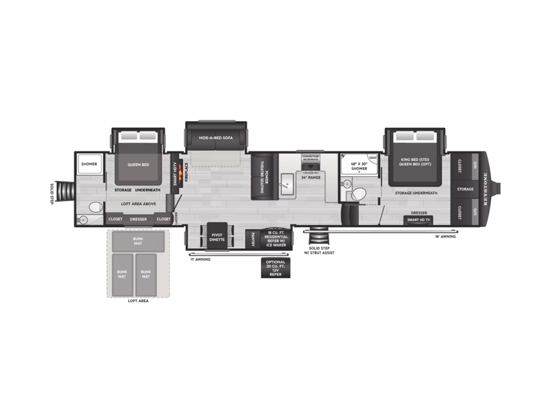 Water connections, black tank flush, outside shower w/ quick connect hose, winterization kit, water heater bypass, power tank fill, waste & water handle valves, 110V outlet, shutoff valve, 12V compartment light, enclosed low point drains, intuitive KeyTV™ satellite/cable/ antennae source control